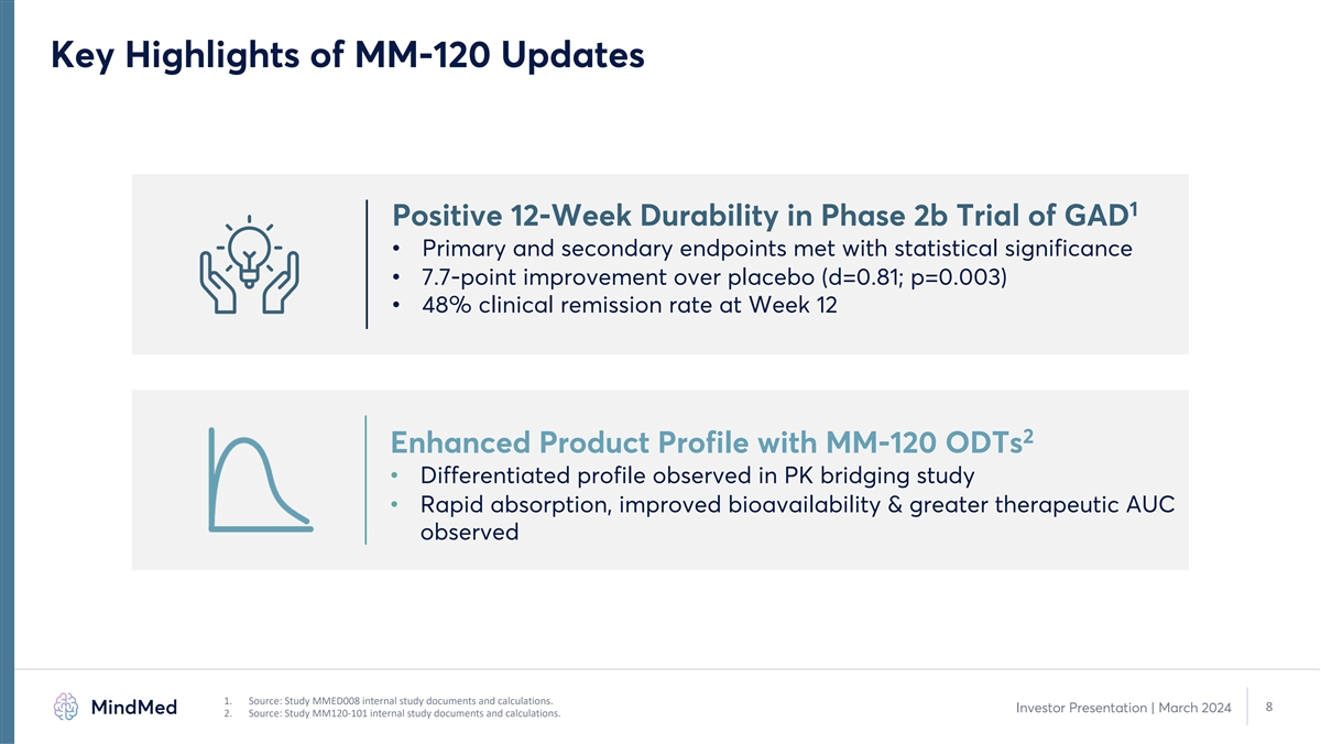 MM-120 Has the Potential to Address a Large Unmet Need in GAD Opportunity in Generalized Anxiety Disorder (GAD) 1 • GAD is the 2nd most common mental disorder among adults , Potential Best-in-Class yet there are limited treatment options Therapy with Novel MOA • Symptoms may be debilitating and treatment inefficacy leads to incomplete remission and intolerable side effects. 1 Large Market 13 million 6.5 million do not respond ~20 million US adults with GAD 3 1 2 to first-line treatment Opportunity receive treatment 77% moderate to severe 1 SSRI/SNRIs : 50% failure rate with often undesirable side effects Benzodiazepines: addiction, tolerance risk; generally used in short-term Significant Need 4 for New Treatments Buspirone : poor efficacy Antipsychotics: short- and long-term risks; poorly tolerated 1. Mental and Substance Use Disorders Prevalence Study (MDPSU): Findings Report 2023. 2. Kessler RC, Chiu WT, Demler O et al. Prevalence, Severity, and Comorbidity of 12-month DSM-IV Disorders in the National Comorbidity Survey-Replication. 2005 Arch Gen Psychiatry; 62(6): 617-627. 7 Investor Presentation | March 2024 3. Ansara, Management of Treatment-Resistant Generalized Anxiety Disorder, Ment Health Clin 2020 Nov; 10(6) 326-334) United States Census Bureau, company calculations. 4. Garakani A, et al., (2020) Pharmacotherapy of Anxiety Disorders: Current and Emerging Treatment Options. Front. Psychiatry 11:595584. doi: 10.3389/fpsyt.2020.595584