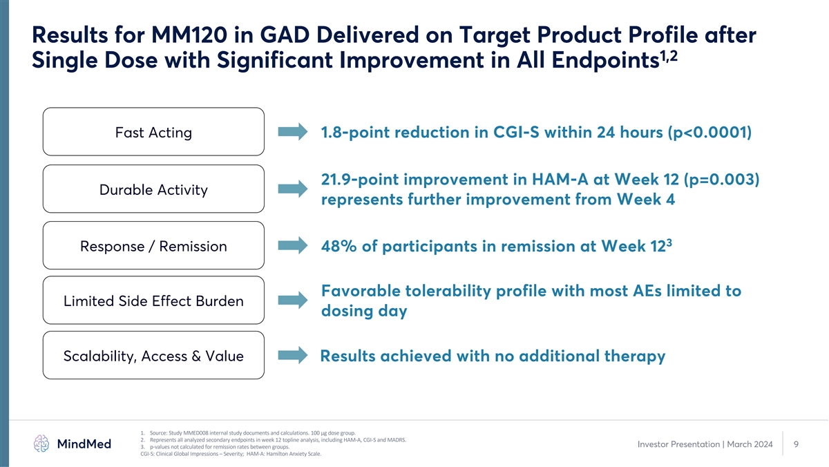 Key Highlights of MM-120 Updates 1 Positive 12-Week Durability in Phase 2b Trial of GAD • Primary and secondary endpoints met with statistical significance • 7.7-point improvement over placebo (d=0.81; p=0.003) • 48% clinical remission rate at Week 12 2 Enhanced Product Profile with MM-120 ODTs • Differentiated profile observed in PK bridging study • Rapid absorption, improved bioavailability & greater therapeutic AUC observed 1. Source: Study MMED008 internal study documents and calculations. 8 Investor Presentation | March 2024 2. Source: Study MM120-101 internal study documents and calculations.