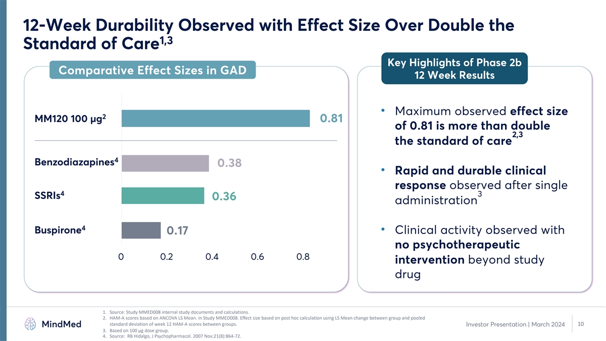 Results for MM120 in GAD Delivered on Target Product Profile after 1,2 Single Dose with Significant Improvement in All Endpoints Fast Acting 1.8-point reduction in CGI-S within 24 hours (p<0.0001) 21.9-point improvement in HAM-A at Week 12 (p=0.003) Durable Activity represents further improvement from Week 4 3 Response / Remission 48% of participants in remission at Week 12 Favorable tolerability profile with most AEs limited to Limited Side Effect Burden dosing day Scalability, Access & Value Results achieved with no additional therapy 1. Source: Study MMED008 internal study documents and calculations. 100 µg dose group. 2. Represents all analyzed secondary endpoints in week 12 topline analysis, including HAM-A, CGI-S and MADRS. Investor Presentation | March 2024 9 3. p-values not calculated for remission rates between groups. CGI-S: Clinical Global Impressions – Severity; HAM-A: Hamilton Anxiety Scale.